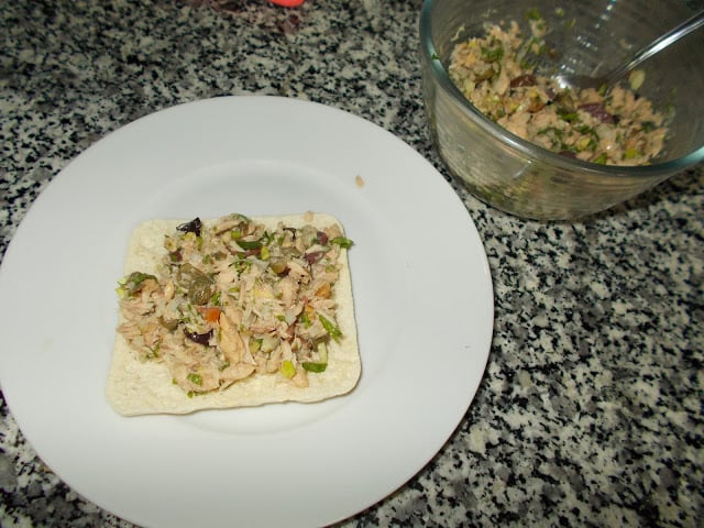 2 tablespoons chopped onion2 tablespoons very finely diced celery2 tablespoons chopped toasted walnutsolive oil to taste ( i didn’t use it)1 tablespoon vinegar1 tablespoon finely minced black olives2 tablespoon finely minced fresh parsley ( i used tabbouleh mix w/ bulgur)juice of 1/2 lemonKosher salt and freshly cracked black pepperto serve: crackers, or toasted breadDirectionsCombine the tuna,onion, capers, celery, walnuts, olive oil, vinegar, olives, parsley and lemon juice in a medium bowl and season with salt and pepper. Top the crackers with the tuna mixture and serve.